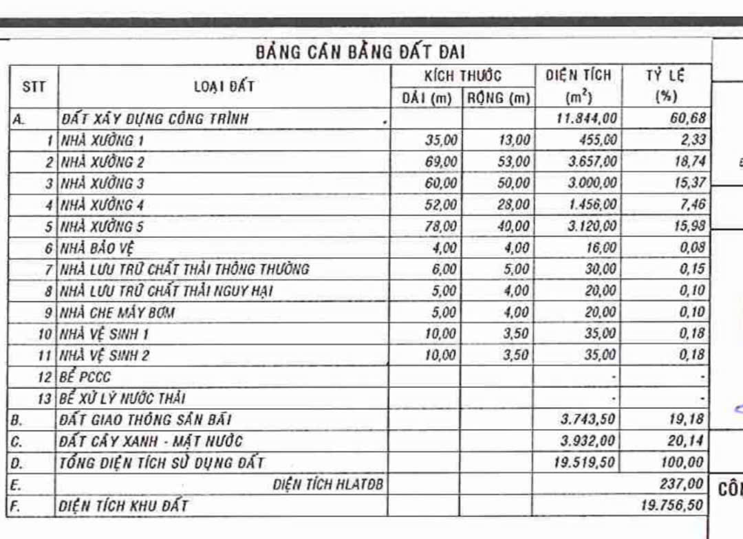 Đất cây xanh – mặt nước: 3.932 m² (~20,14%) tạo cảnh quan và điều kiện sản xuất thân thiện môi trường